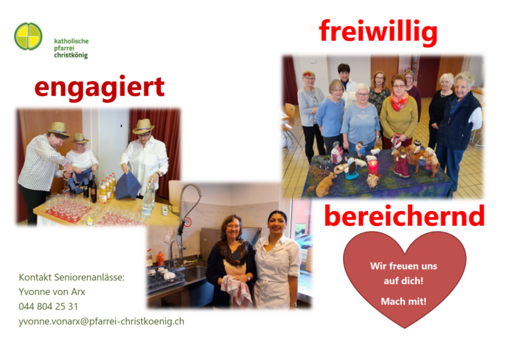 Kontakt: Yvonne von Arx, Tel. 044 804 25 31 oder yvonne.vonarx@pfarrei-christkoenig.ch